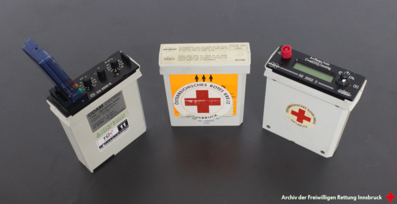 Bruker Defigard 2002: Zusatzmodul für externen Herzschrittmacher DG 2000 E, Akku der Fa. Bruker und Modul DG 2002 C zur Nebenstromkapnometrie. – Archiv der Freiwilligen Rettung Innsbruck.