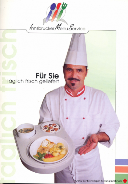 Deckblatt einer Broschüre des Innsbrucker Sozialfonds zum Innsbrucker Menü Service nach Namensänderung und Umstellung auf Cook-&-Chill-Verfahren, 2001. – Broschüre, DIN A5. – Archiv der Freiwilligen Rettung Innsbruck.